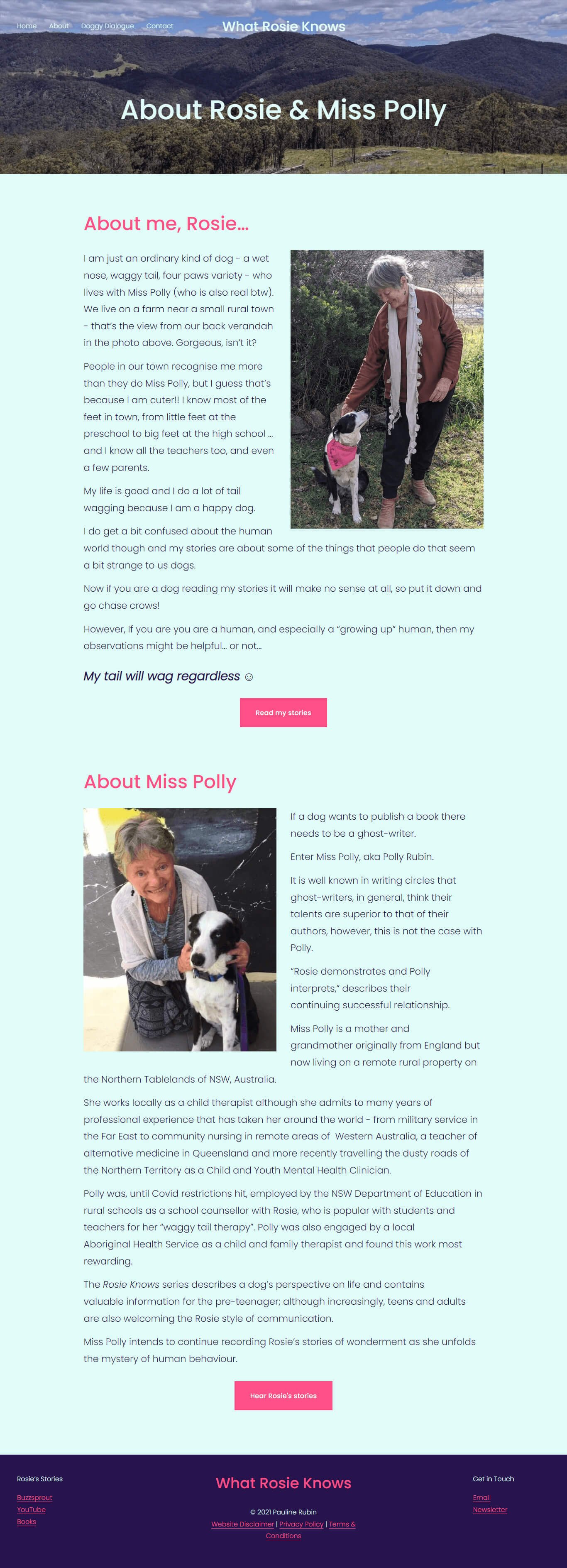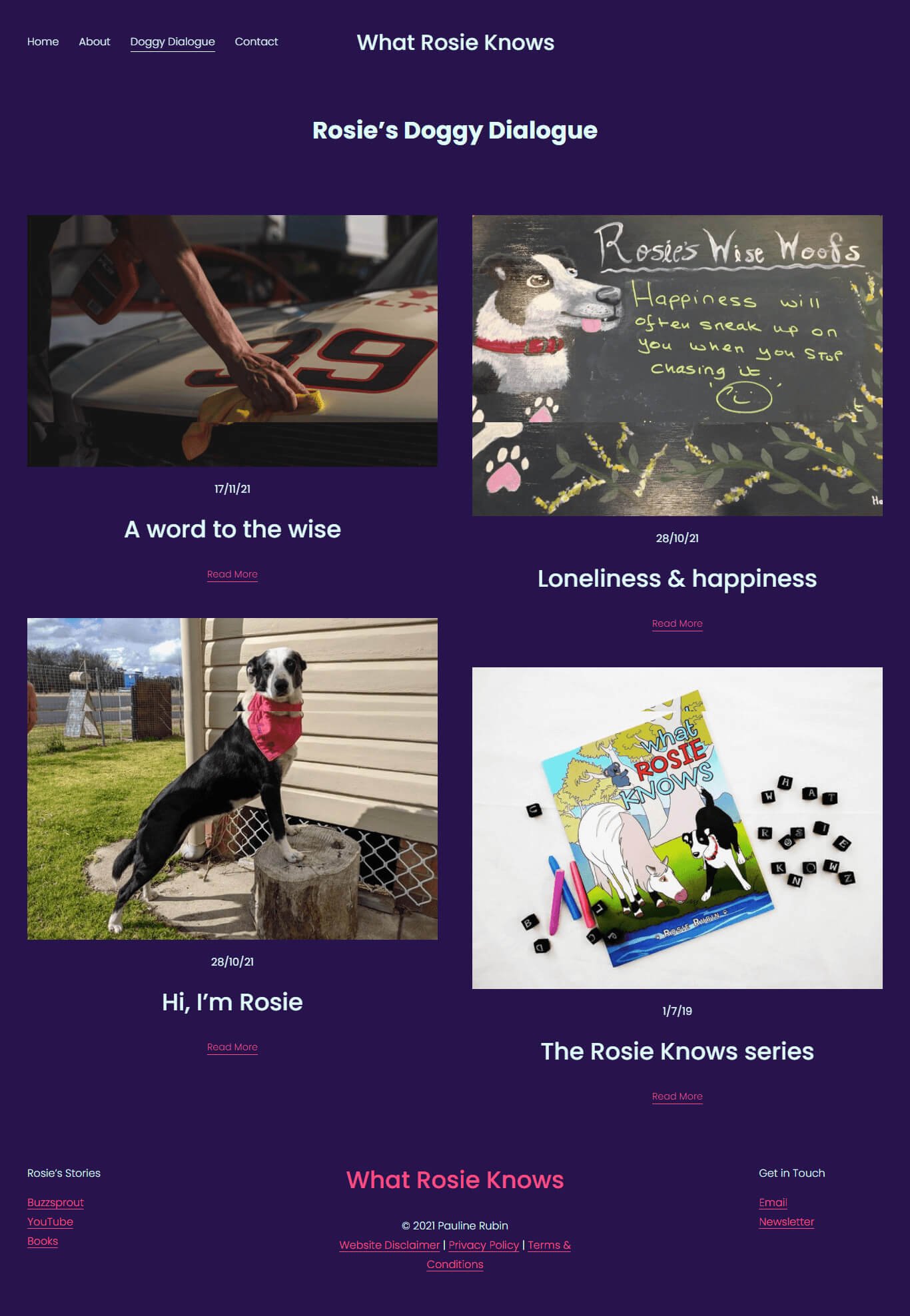 With parents, teachers, caregivers and children as the intended audience we chose a colourful palette with emphasis on the pink of Rosie’s iconic therapy dog bandanna, and lots of images of Rosie and her friends.